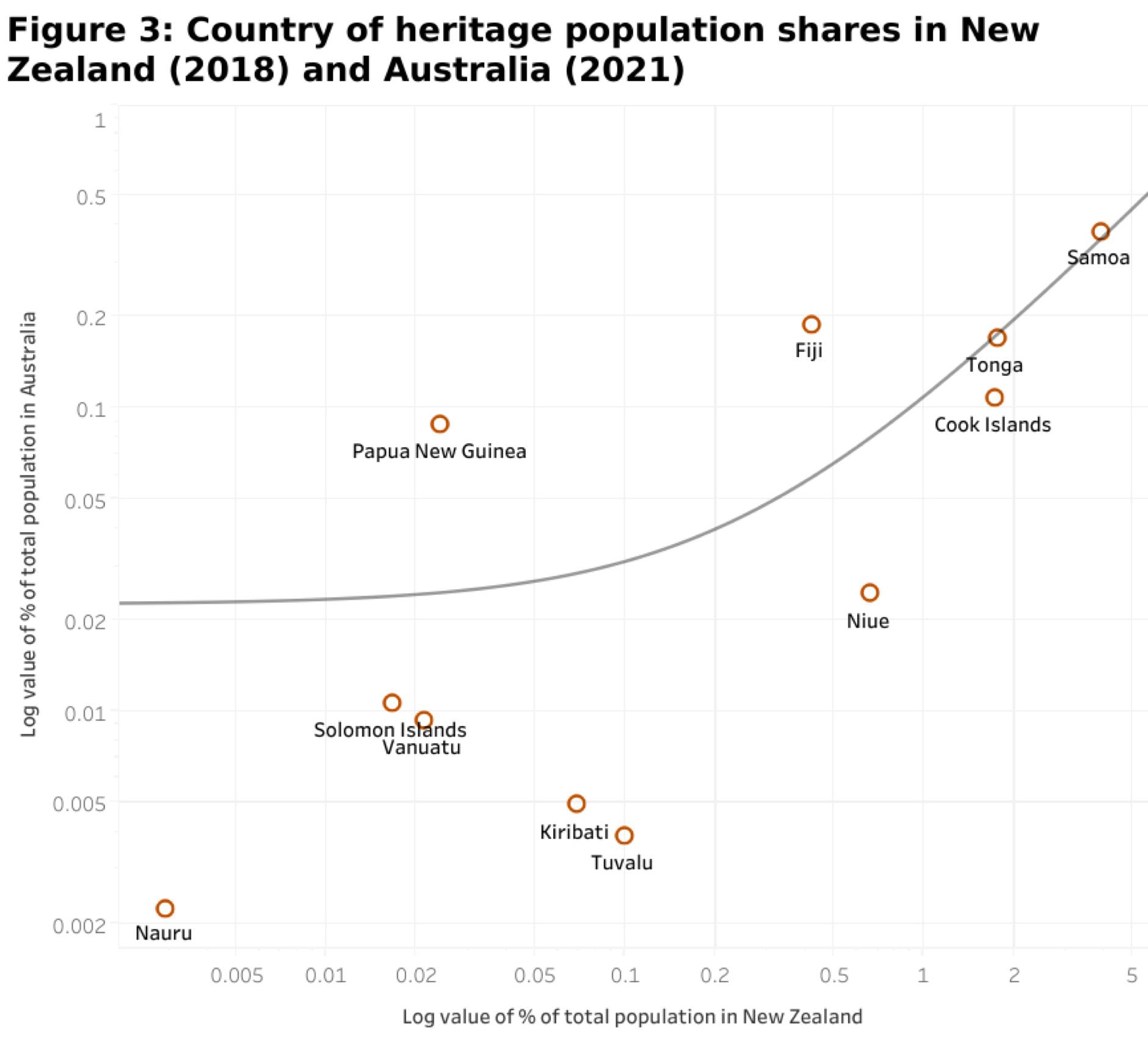 There is a strong correlation between the share of the various Pacific nationalities in Australia and in New Zealand. PNG is the only Pacific country of heritage with a higher share of the Australian population than New Zealand.