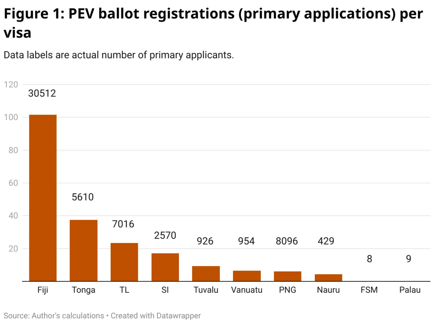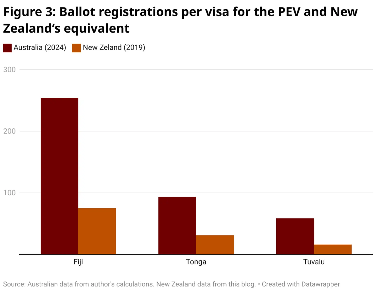 New Zealand has long had its own PEV equivalent. In the three countries in which both visas are available, Australia’s PEV seems to have been more popular (Figure 3). For example, in Fiji, in 2019 (the last year for which I have been able to find the NZ data), there were 75 total applications for the NZ visa, compared to 254 for this visa (including the assumed number of family members).