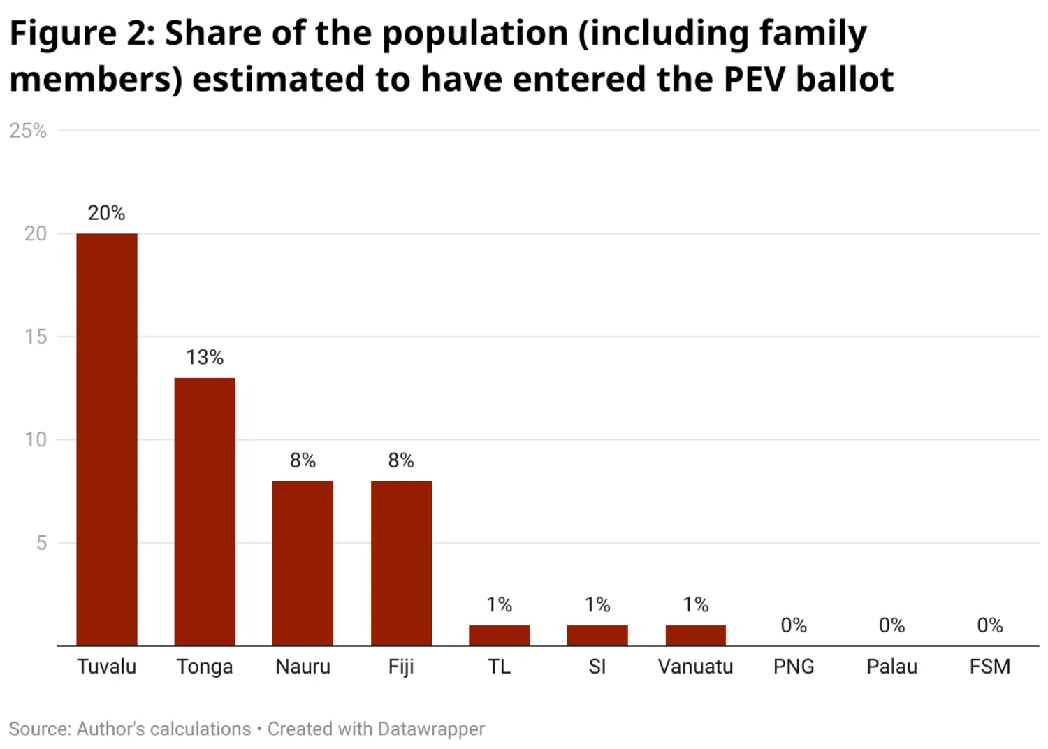 PEV primary applicants could also register family members in the ballot. I assume that on average primary applicants registered 1.5 unique family members for the visa. (This is no more than what seems like a reasonable guess. Data on this has not been made available.) On this assumption, 20% of Tuvalu’s population applied for the PEV, 13% of Tonga's, and 8% of Nauru's and Fiji's (Figure 2).