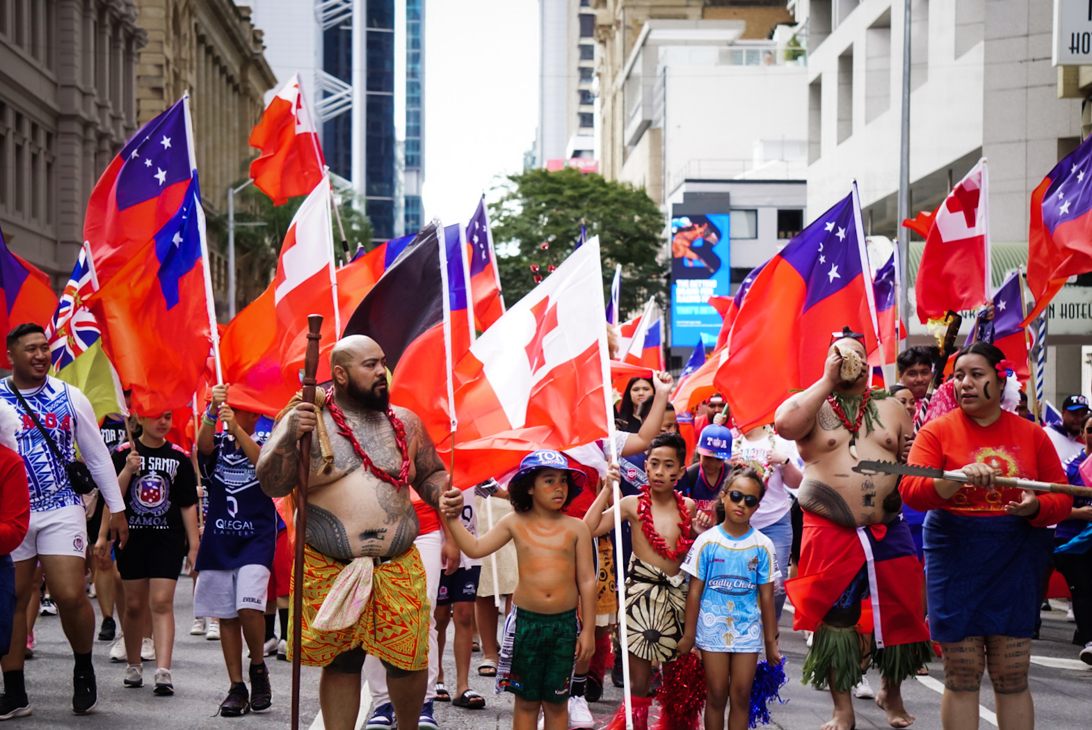 Hundreds of Samoan and Tongan families blocked one part of a Brisbane city street, to join compatriots in Apia, as they showed support for their Rugby League World Cup teams.