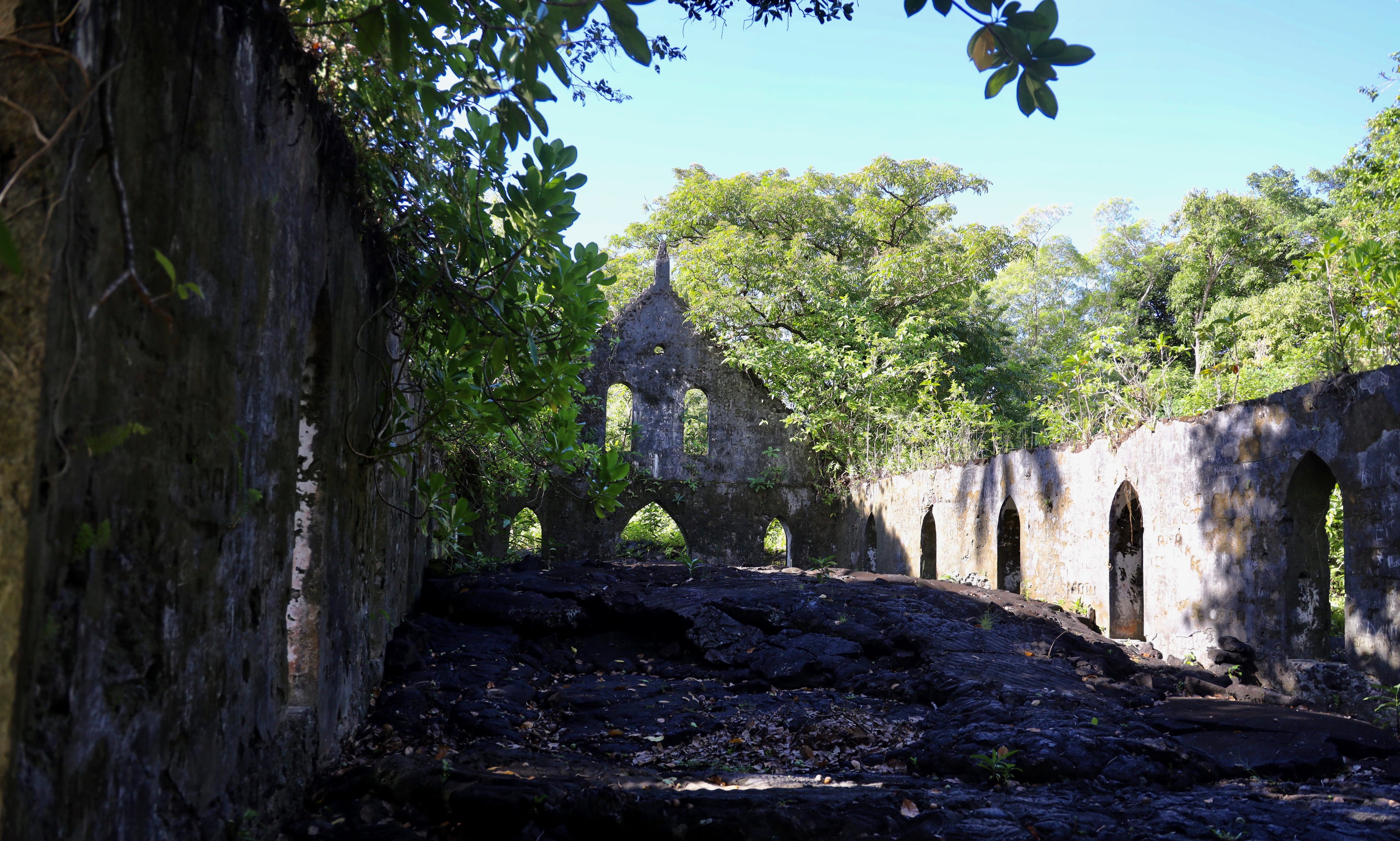Within the Saleaula site are three wonderful opportunities to take stock of the mountain's strength. One of the first things you see after the blooming frangipani in the entrance is what is left of a London Missionary Society church.