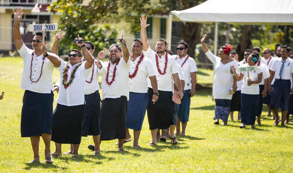 Aumua and Tuala both raised the Samoa national flag as their members looked on from below the raised flag foundation, standing in groups based on their alumni graduation years from Saint Joseph’s College.