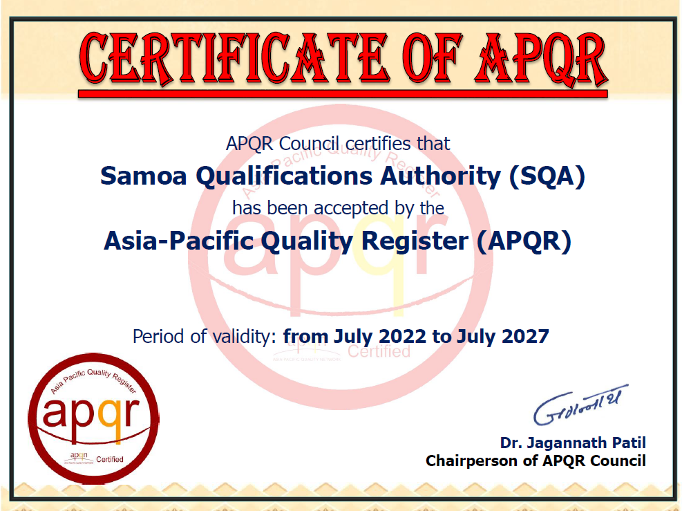 In comes in the form of the international recognition of Samoa qualifications as well as the S.Q.A itself as a national Quality Assurance Agency, approved by the Asia Pacific Quality Network Council (APQRC) to be included on the Asia Pacific Quality Register in July 2022.