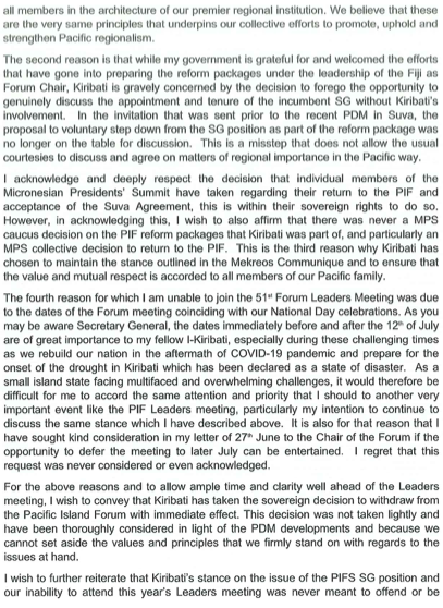 For the above reasons and to allow ample time and clarity well ahead of the Leaders meeting, I wish to convey that Kiribati has taken the sovereign decision to withdraw from the Pacific Island Forum with immediate effect. This decision was not taken lightly and have been thoroughly considered in light of the PDM developments and because we cannot set aside the values and principles that we firmly stand on with regards to the issues at hand.