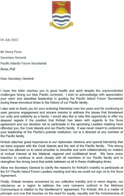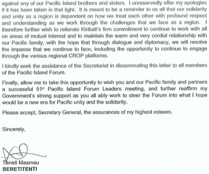 See below the full text of the letter by the Kiribati President Taneti Maamau addressed to PIF Secretary General, Mr Henry Puna.