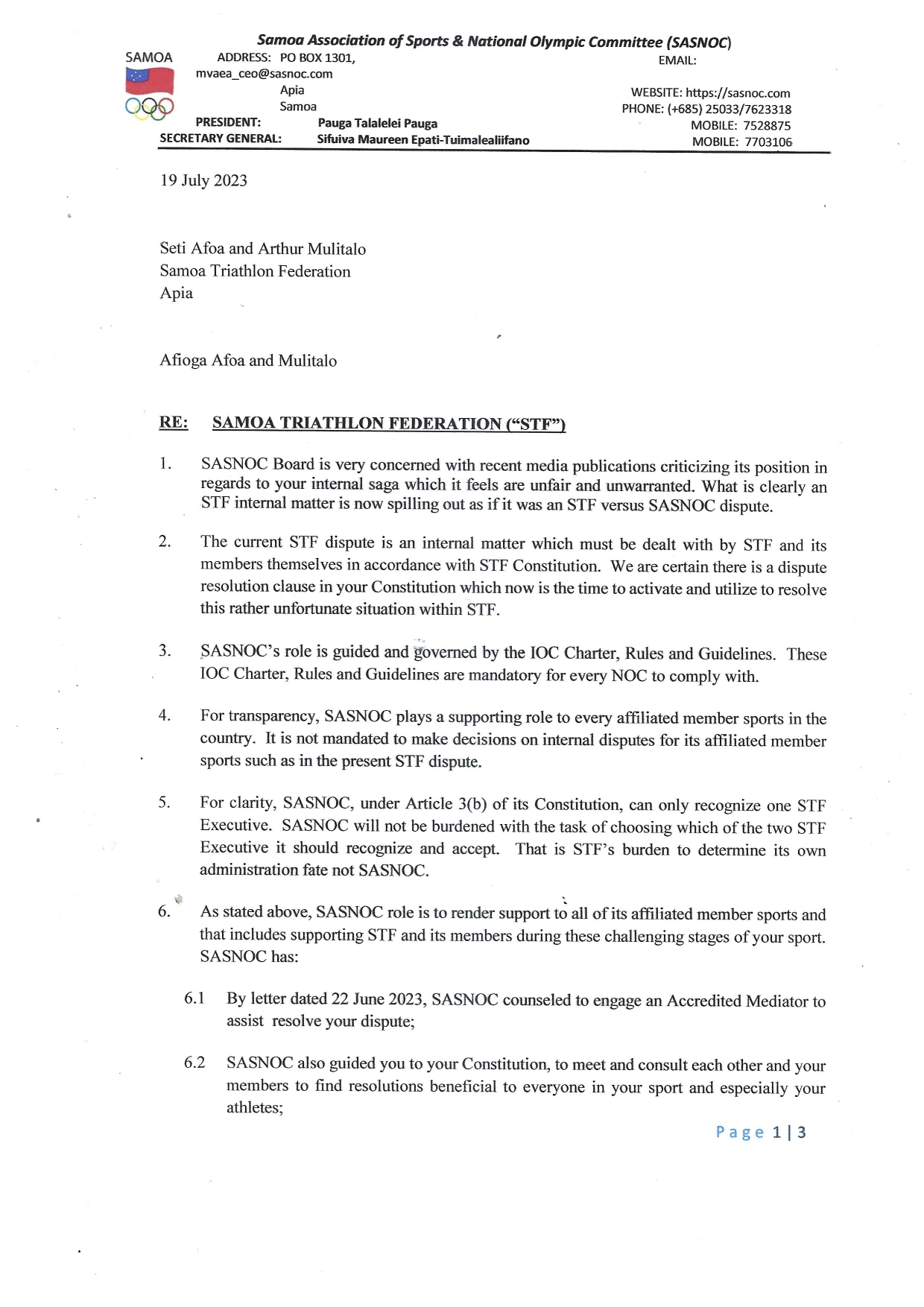 Here is the full S.A.S.N.O.C. letter dated 19 July 2023 addressed to S.T.F. executives Seti Afoa and Arthur Mulitalo advising of the suspension of the federation.