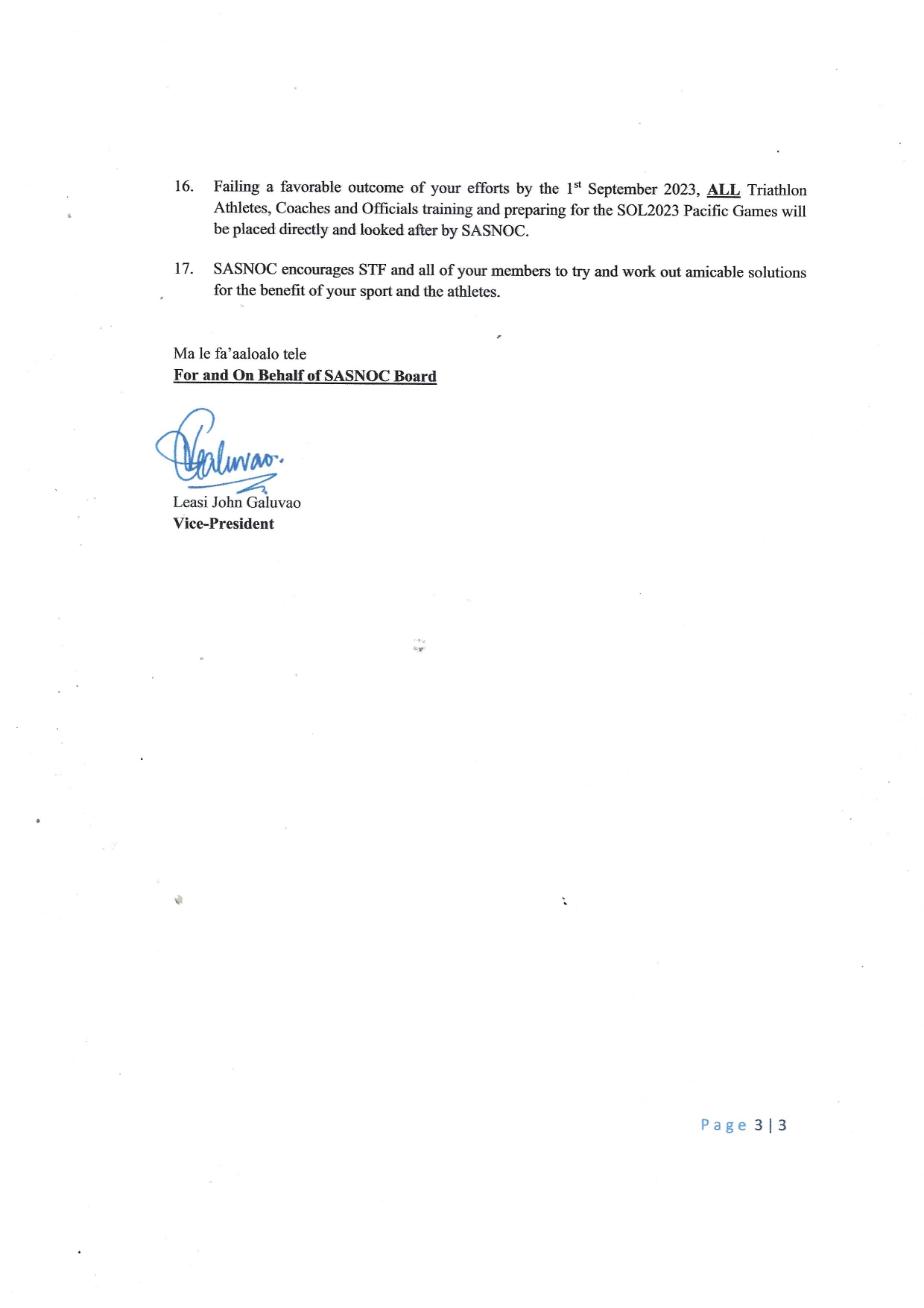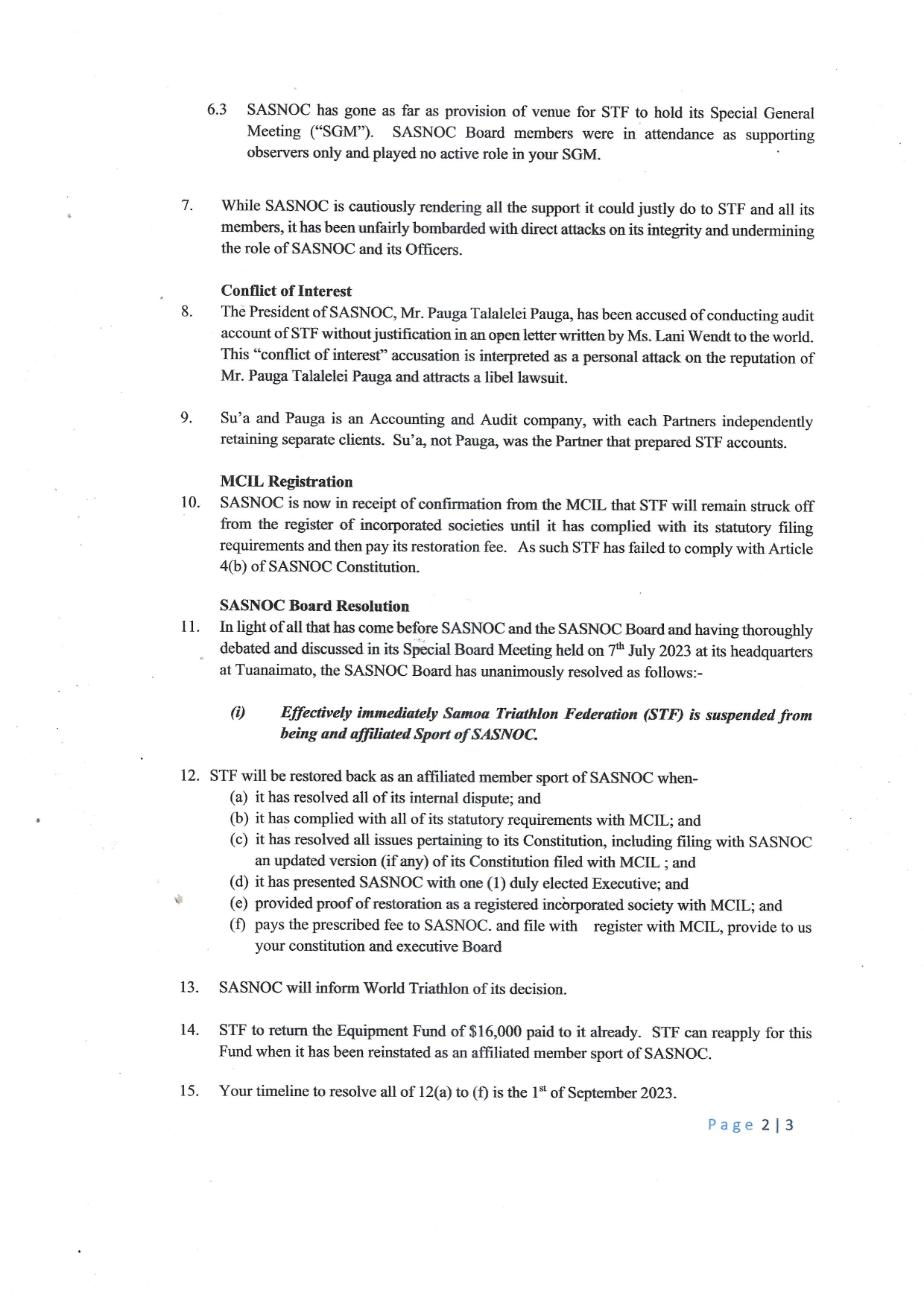 “In light of all that has come before S.A.S.N.O.C. and the S.A.S.N.O.C. Board and having thoroughly debated and discussed in its Special Board Meeting held on 7th July 2023 at its headquarters at Tuanaimato, the S.A.S.N.O.C. Board has unanimously resolved as follows: (i) Effectively immediately Samoa Triathlon Federation (S.T.F.) is suspended from being an affiliated sport of SASNOC,” read Leasi’s letter.