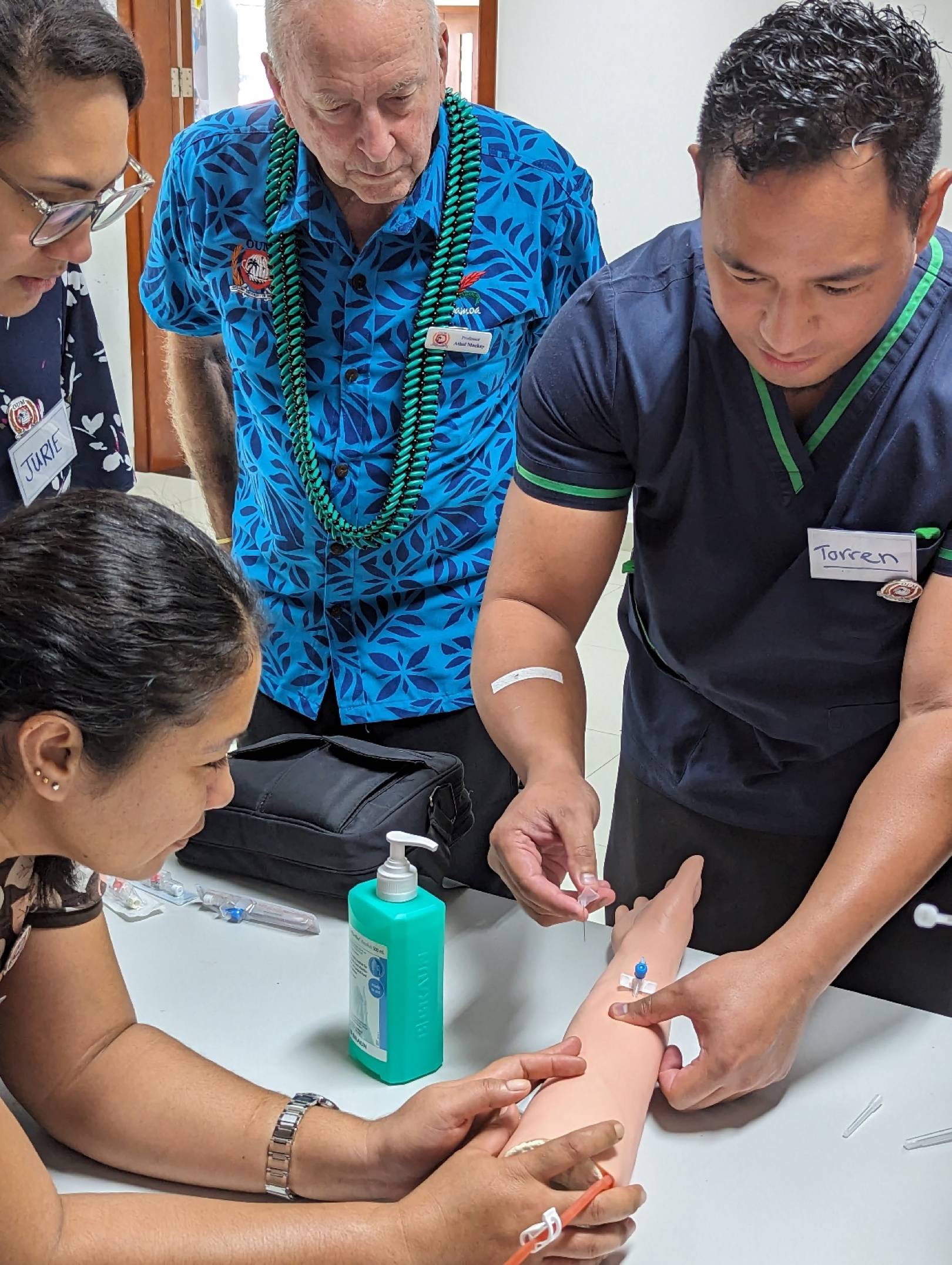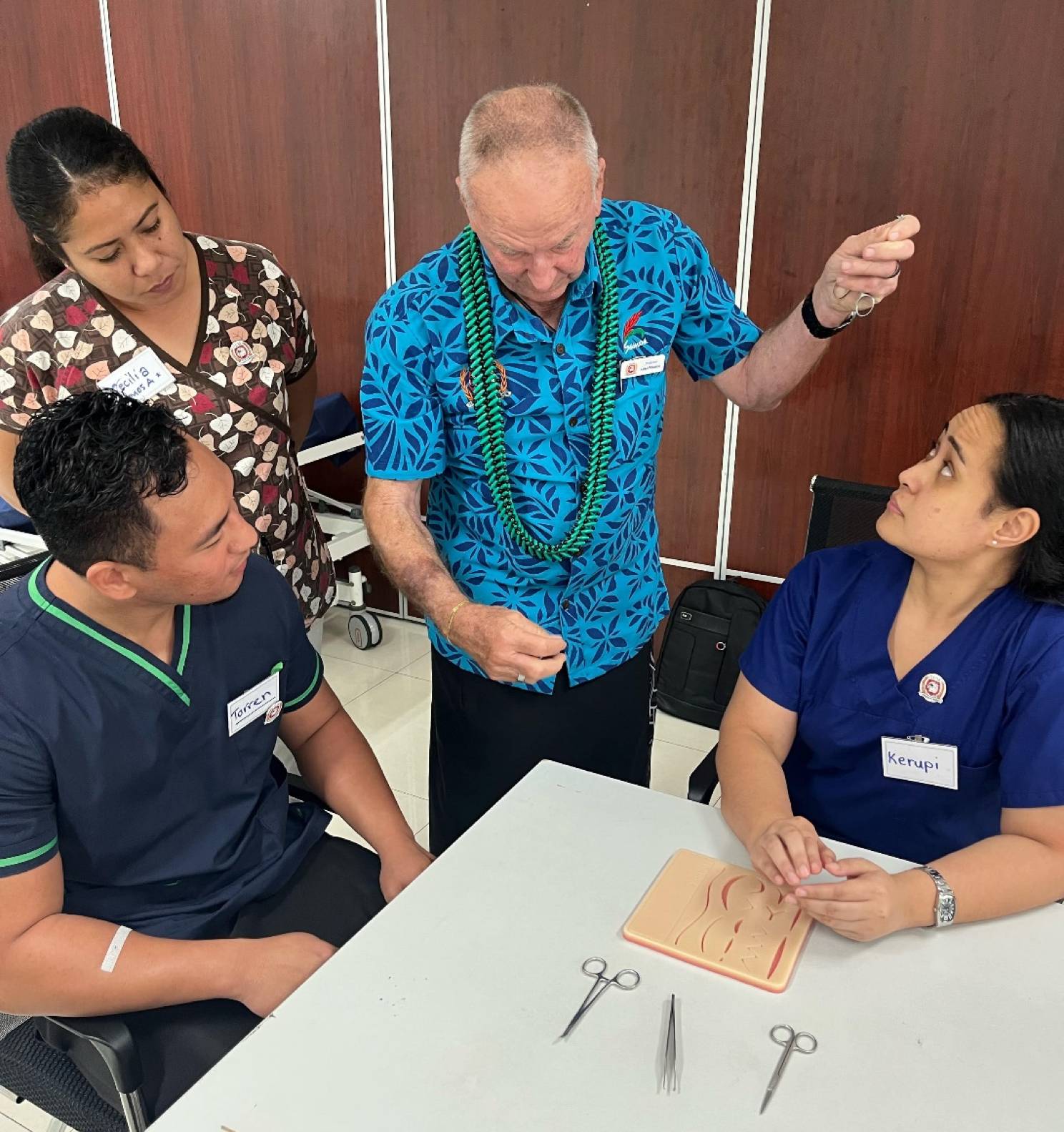 Tutors of the Clinical Skills Workshop include local and international lecturers - Course Coordinator - Dr David Mountford (Australia), O.U.M. V.C. Professor Athol MacKay (Australia), Papalii Dr Tito Kamu (Paediatrics), Mulitalo Dr George Tuitama (Psychiatry), Dr Nola Fuamatu (Emergency Department), RN Taiaopo E'etau (Wound Management), RN Daru Heaven Isaia (Scrubbing in Theatre), and Prof. Satu (Samoa).