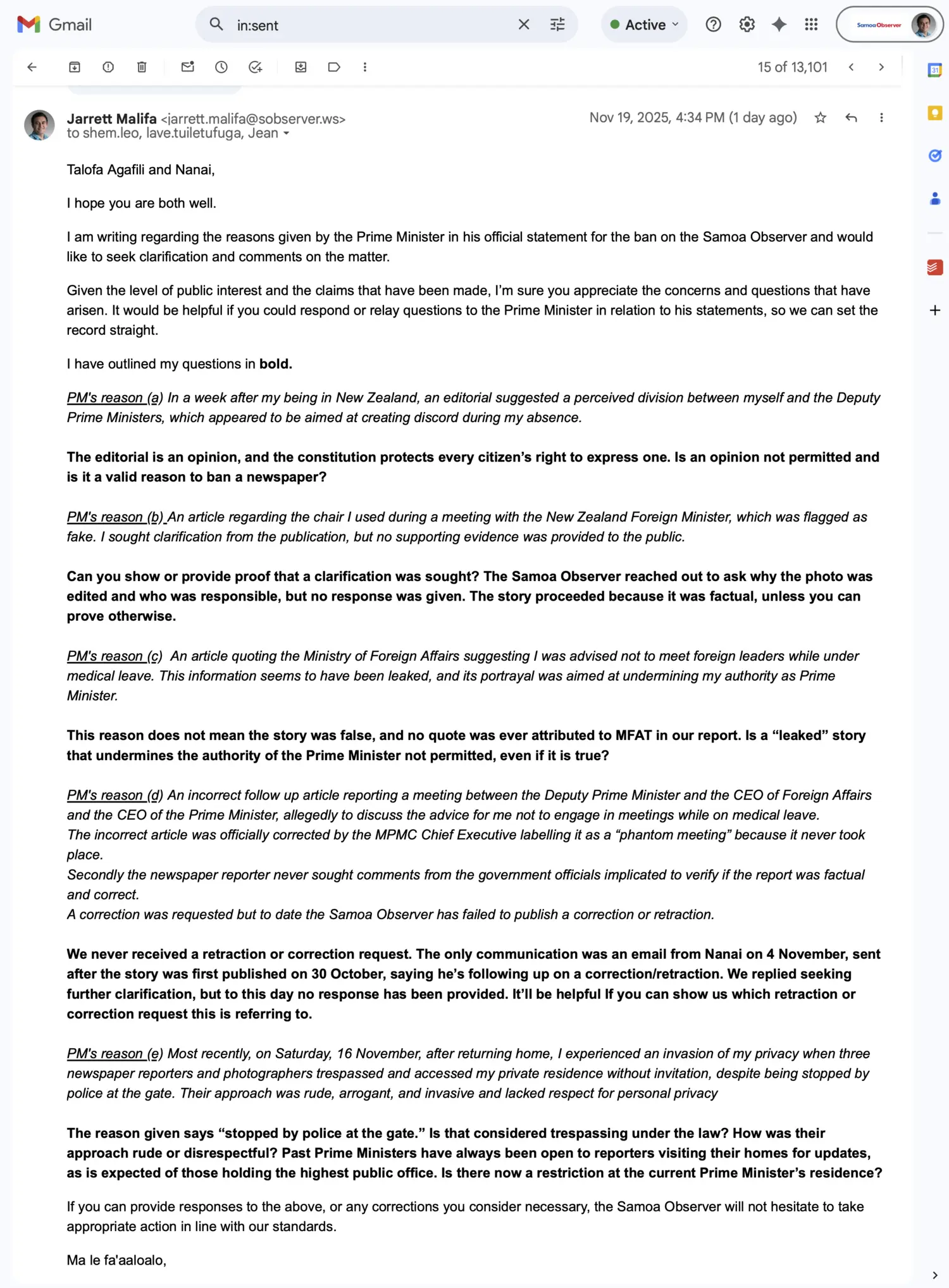 The Samoa Observer also invited the Government to identify any corrections it believed were necessary, saying it would take appropriate action in line with the masthead’s editorial standards.