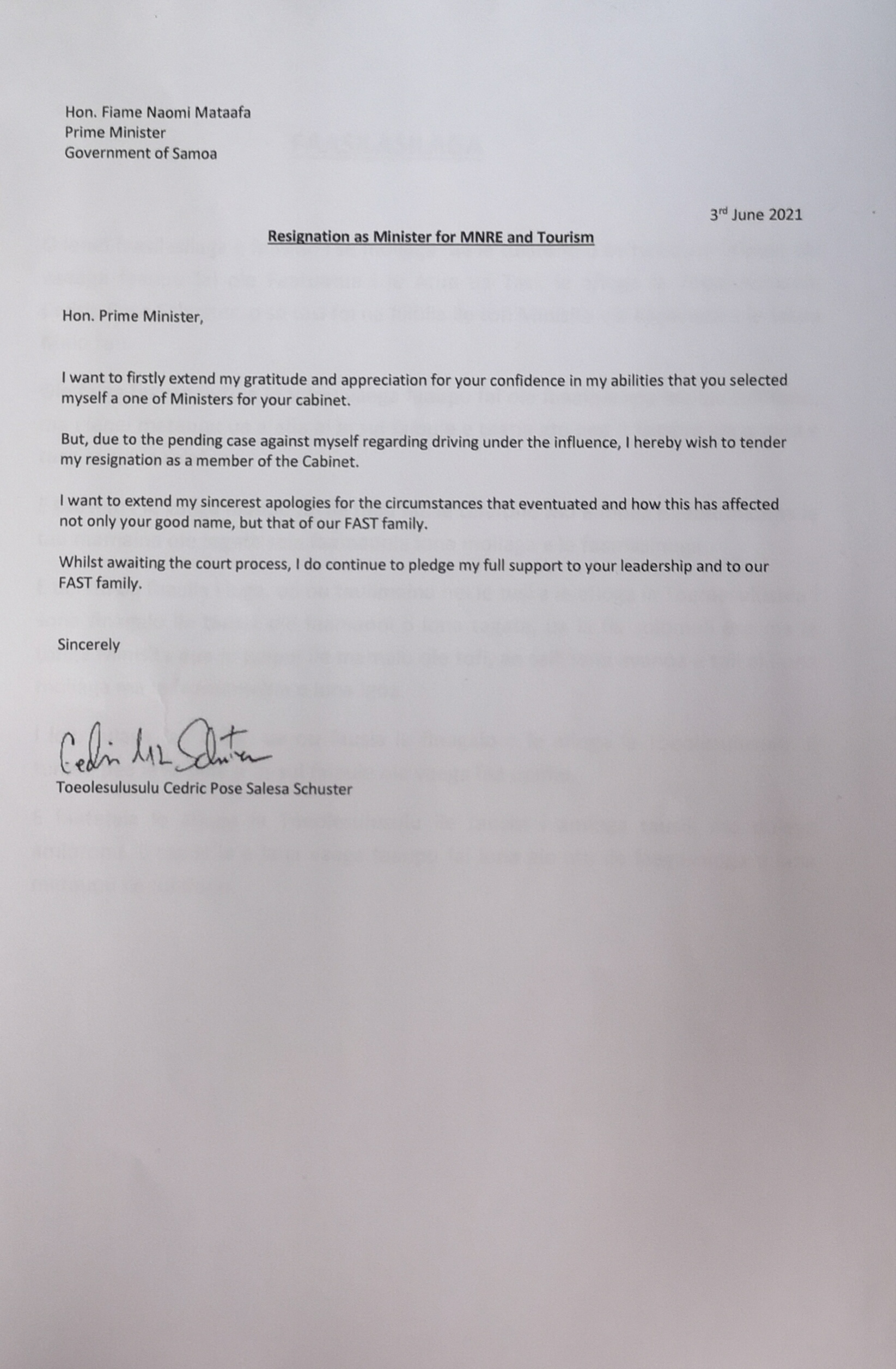 Cabinet Minister elect Toesulusulu Cedric Schuster has resigned from his Ministerial portfolio, the Prime Minister-elect, Fiame Naomi Mata'afa has confirmed during a live broadcast on Thursday.