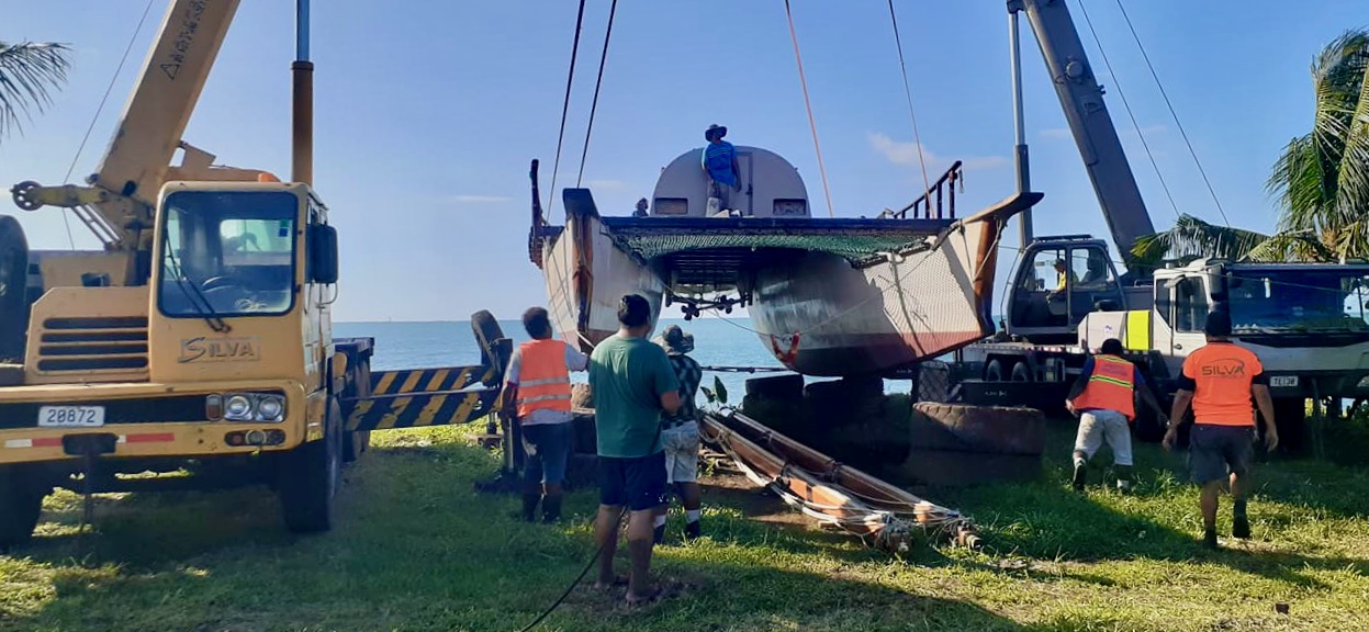 During the dry dock process, the core crew patched and filled dents and dings in both hulls and worked with the Samoa Shipping Corporation to apply a new layer of much needed anti-fouling. The masts, booms, planks and steering foe were sanded, patched, re-vanished and re-rigged.