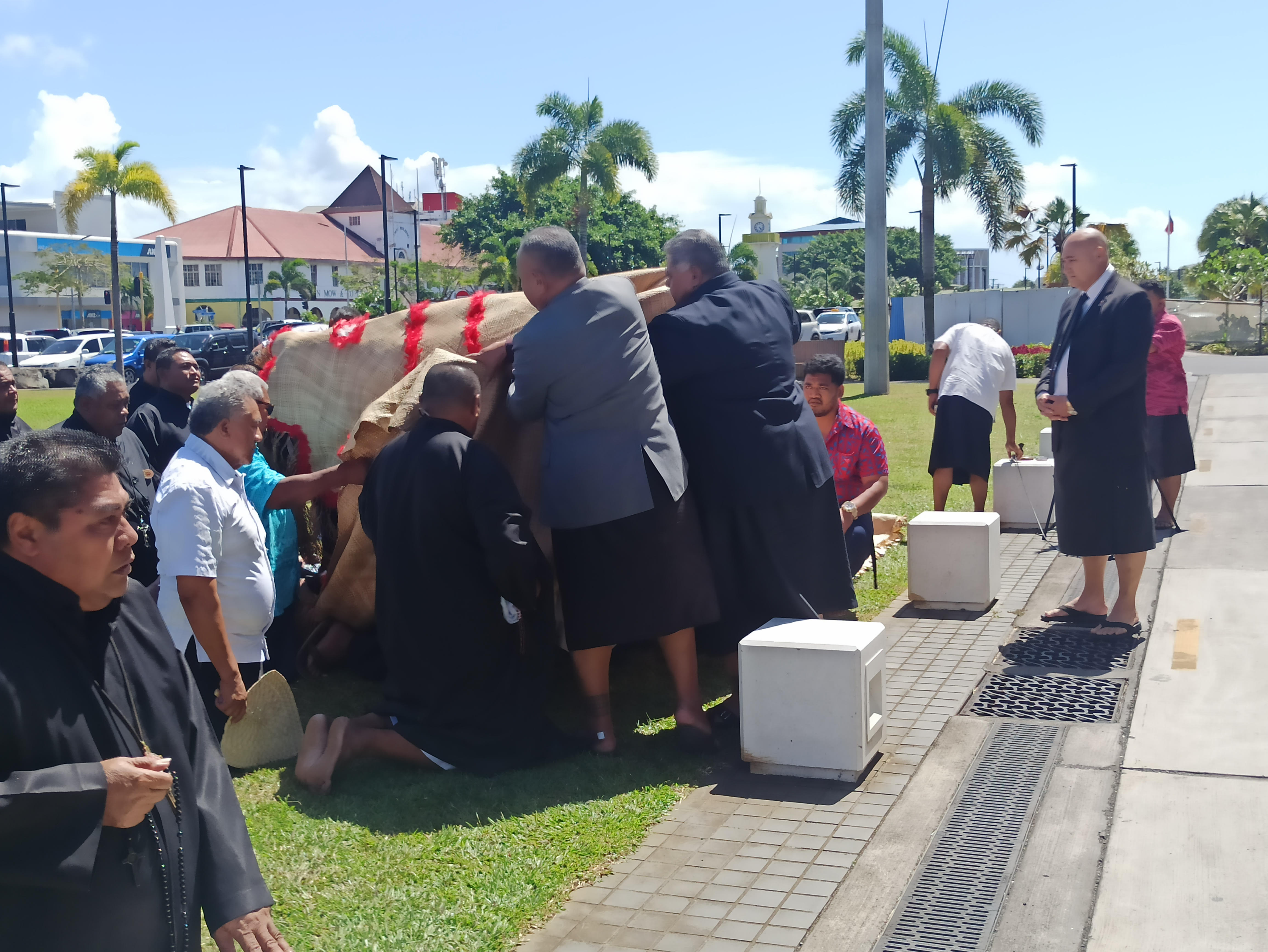 The Archbishop of the Catholic Church and members of the Archdiocese of Apia are currently in front of the Government building performing an ifoga asking the Government for peace.